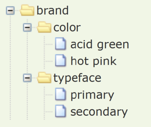 The names of the groups leading to a given token (including that token's name) are that token's path, which is a computed property. It is not specified in the file, but parsers that conform to this spec MUST be able to expose the path of a token. The above example, therefore, defines 4 design tokens with the following properties: